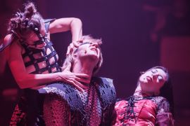 Not only that, but Vampiress Burnside’s aerial choreography never ceases to dazzle, and there’s a lot of it being executed high above the stage by Butler, Fictum, and Burnside herself in one dream or dreamlike sequence after another. (There’s some nifty, more traditional choreography too by Burnside and assistant director Melissa Meyer.)