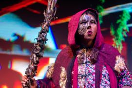 Not only does this make Wisteria’s latest something fresh and new from the get-go, when combined with another Wisteria hallmark, i.e., Disney-style animated backdrops projected in brilliantly saturated colors on an upstage-wall-filling LED screen, this is truly A Whole New Into The Woods, both conceptually and visually, and that’s not all.
