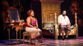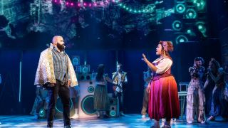 Masterfully directed by Luke Sheppard (who has taken the show from its 2019 Manchester, England debut to the West End and then on to Toronto and Broadway), & Juliet has been just gloriously and resplendently designed by Soutra Gilmour (sets), Andrzej Goulding (video and projections), Paloma Young (costumes), Howard Hudson (lighting), J. Jared Janas (hair, wigs, and makeup), and Gareth Owen (sound), whose contributions make each and every new scene a veritable feast for the eyes and the ears.