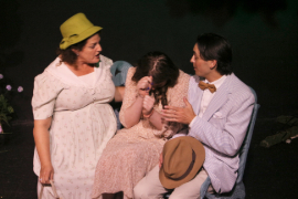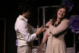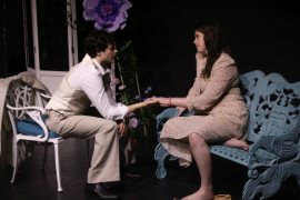 At least Caspian’s scenic design with its gauzy drapes and gigantic tropical flowers exhibits some sense of style and vision, and Davin Harris’s lighting is quite good, though Catherine’s hair and costuming is about as wrong for the 1930s setting as the performance itself.
