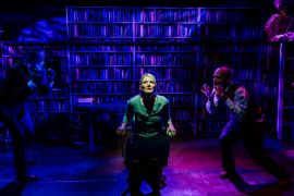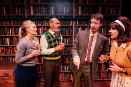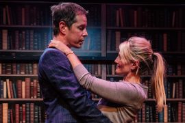 Schwartz scores sky-high marks for a wide-screen set that had me convinced there were shelves and shelves of books backing the action, but not for Philip’s anachronistic tape recorder.