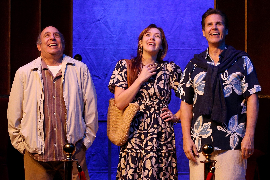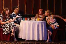 There’s nothing at all “community theater” about Mimi Hrivnak’s set (a couple of smartly appointed cabins that revolve individually to reveal a pair of matching dining room booths) or Daniel Kruger’s just-right costumes or Michele Goffeau’s shipshape props or Michael Thorpe’s expert lighting or Emaline Johnson’s equally fine sound design.